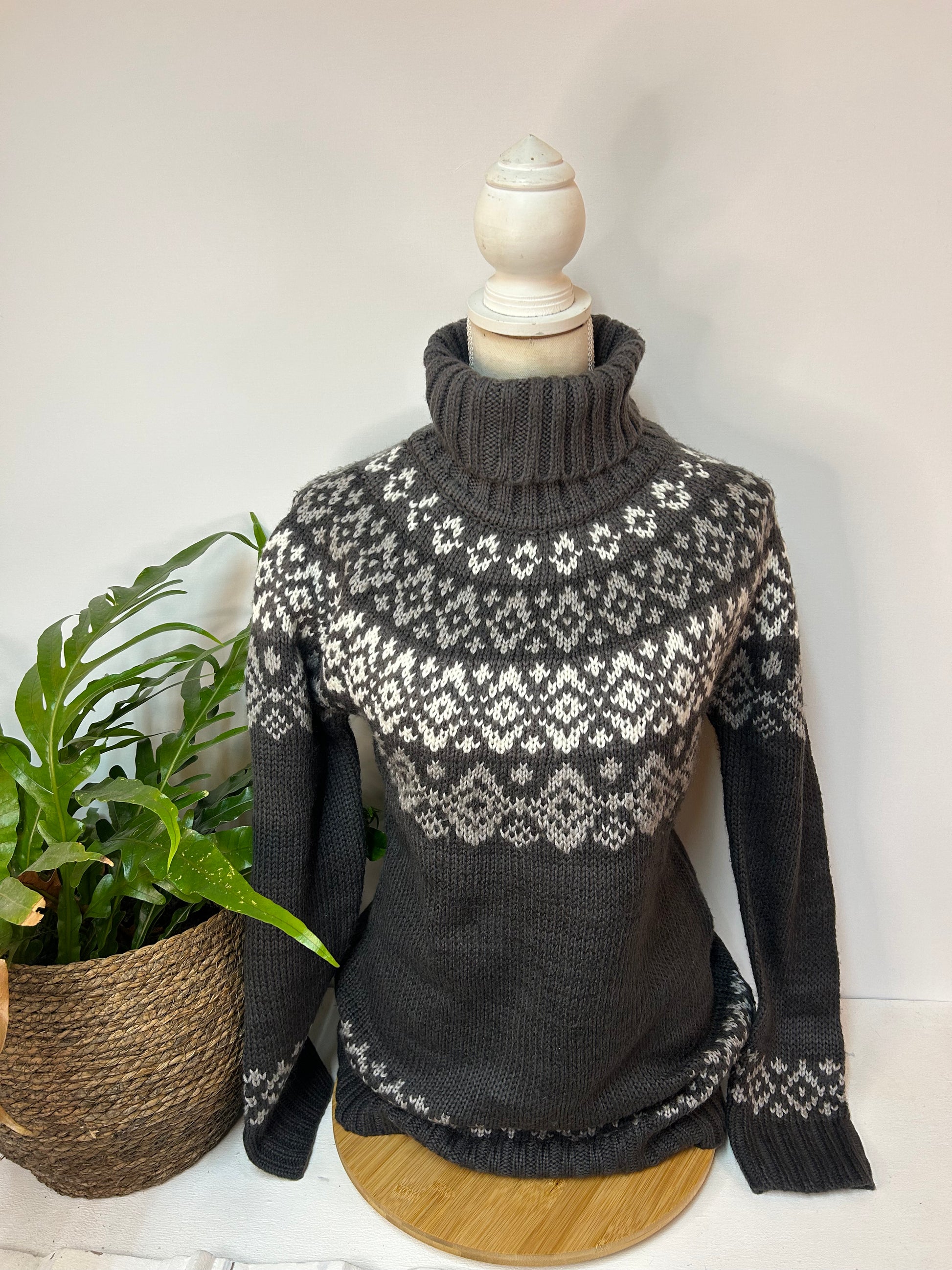 Dunkelgrauer Rollkragenpullover mit weißem Norwegermuster - Yessica - Gr. M / 38