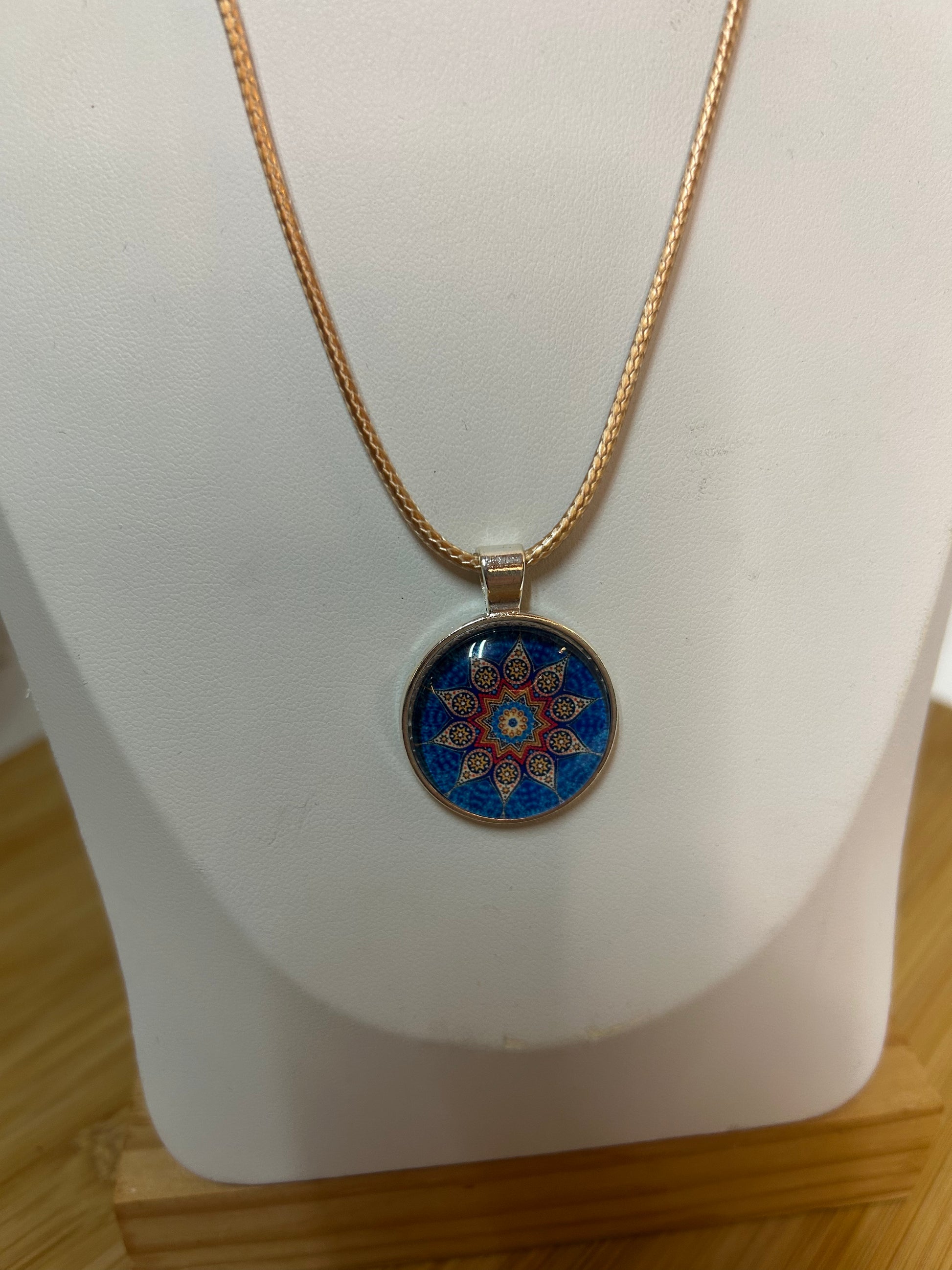 Cabochon Kette Mandala Rot,Blau & Beige Metallfassung - Schmuck - Handgemacht